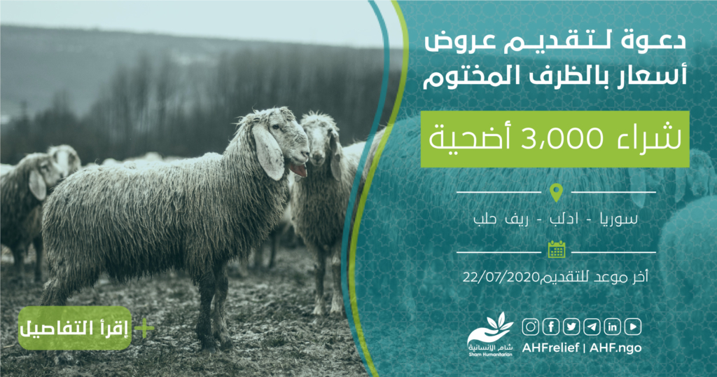 تعلن جمعية شام الإنسانية عن مناقصة بالظرف المختوم لشراء ثلاث آلاف أضحية (3.000) في ادلب وريف حلب حسب دفتر شروط المناقصة المرفق أدناه.
