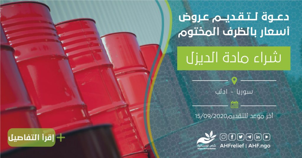 تعلن جمعية شام الإنسانية عن مناقصة بالظرف المختوم لشراء مادة الديزل حسب دفتر شروط المناقصة المرفق أدناه.