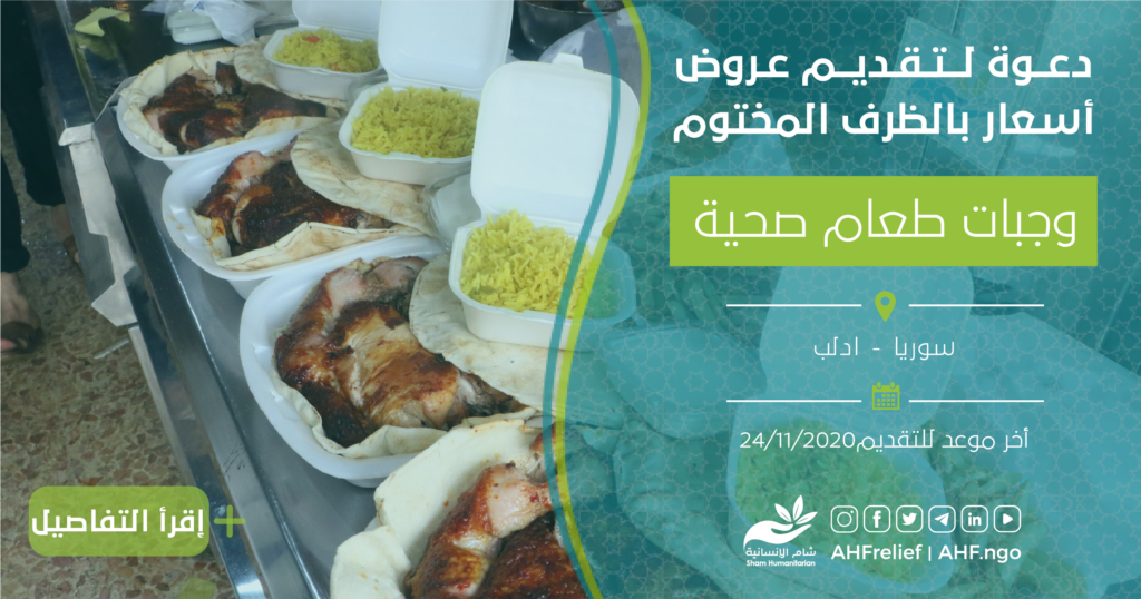 تعلن جمعية شام الإنسانية عن مناقصة بالظرف المختوم لتقديم عروض اسعار وجبات طعام صحية بناء على دفتر شروط المناقصة المرفق أدناه.