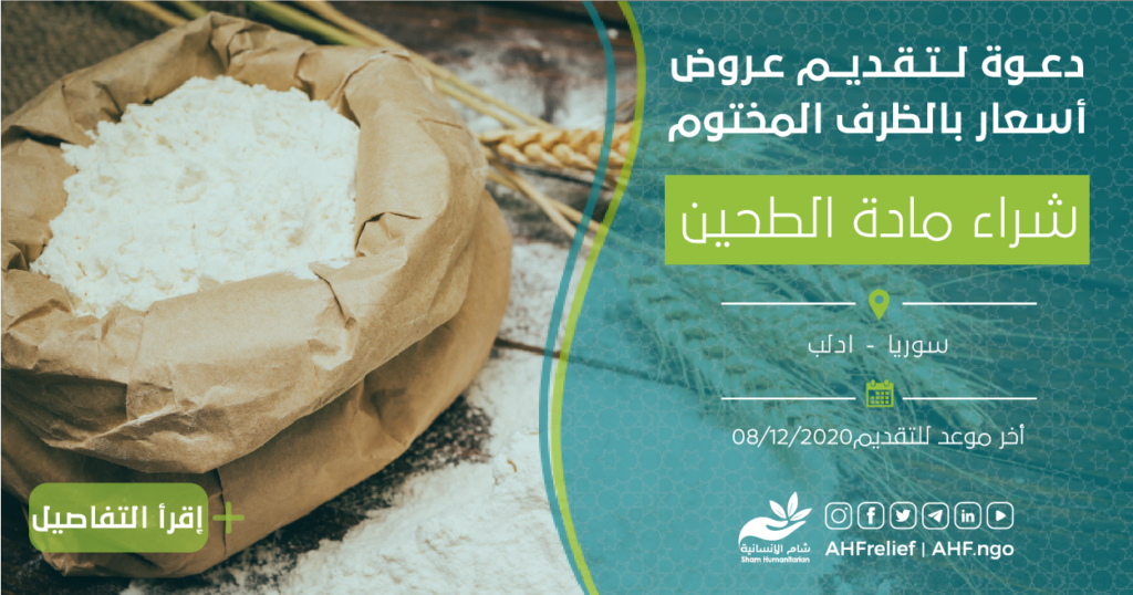 تعلن جمعية شام الإنسانية عن مناقصة بالظرف المختوم لتقديم عروض اسعار مادة الطحين بناء على دفتر شروط المناقصة المرفق أدناه.