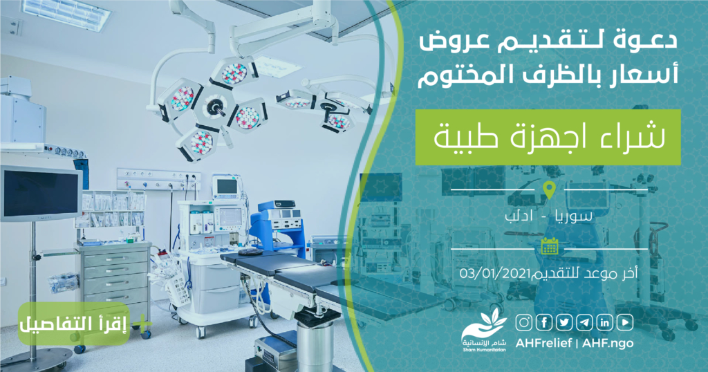 تعلن جمعية شام الإنسانية عن مناقصة بالظرف المختوم لتقديم عروض اسعار اجهزة طبية بناء على دفتر شروط المناقصة المرفق أدناه.