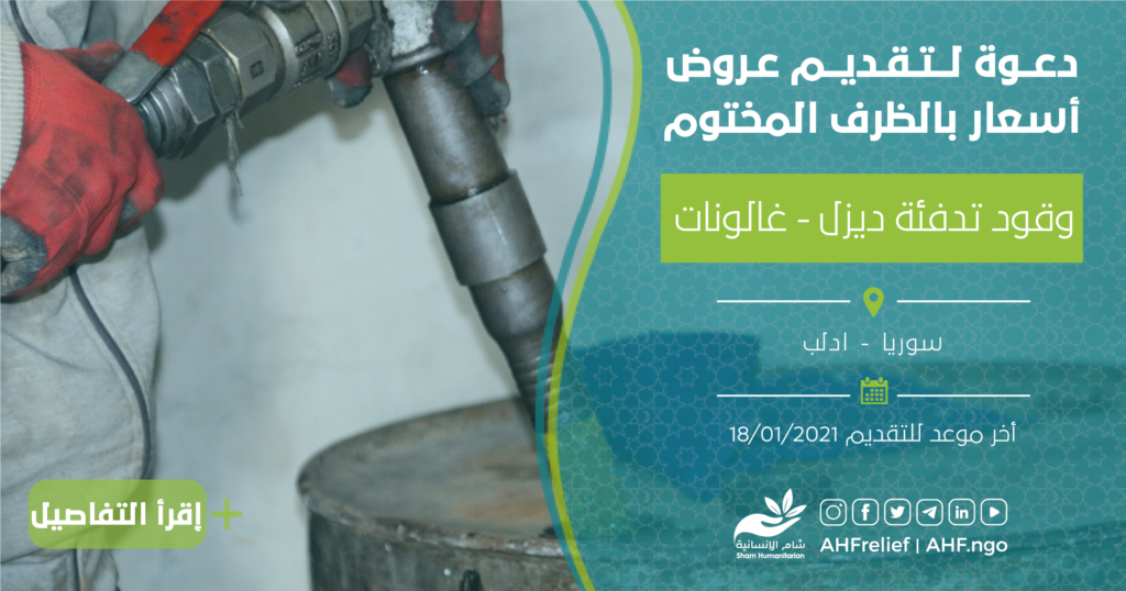 تعلن جمعية شام الإنسانية عن مناقصة بالظرف المختوم لتقديم عروض اسعار وقود تدفئة ديزل – غالونات بناء على دفتر شروط المناقصة المرفق أدناه.