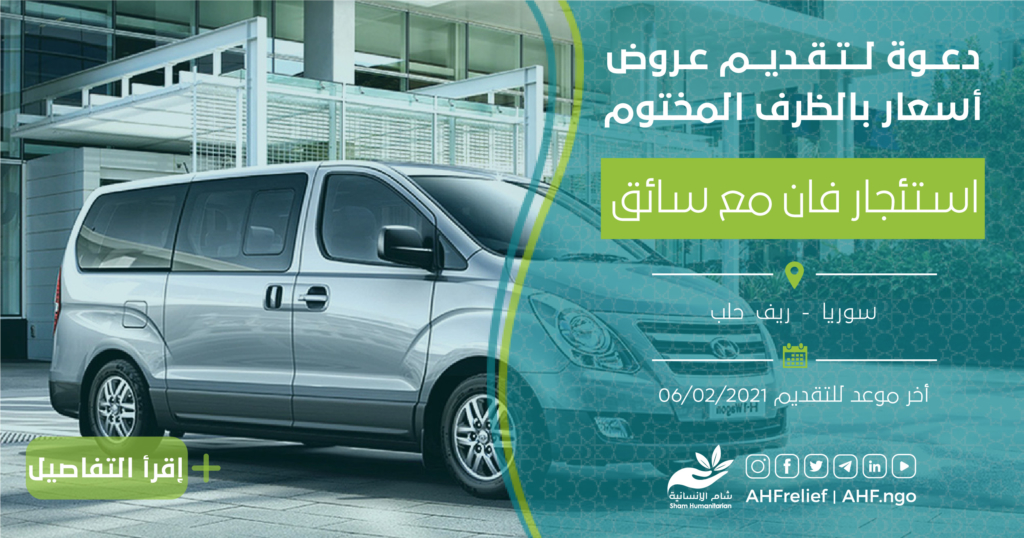 تعلن جمعية شام الإنسانية عن مناقصة بالظرف المختوم لتقديم عروض اسعار استئجار فان مع سائق ووقود والصيانة بناء على دفتر شروط المناقصة المرفق أدناه.