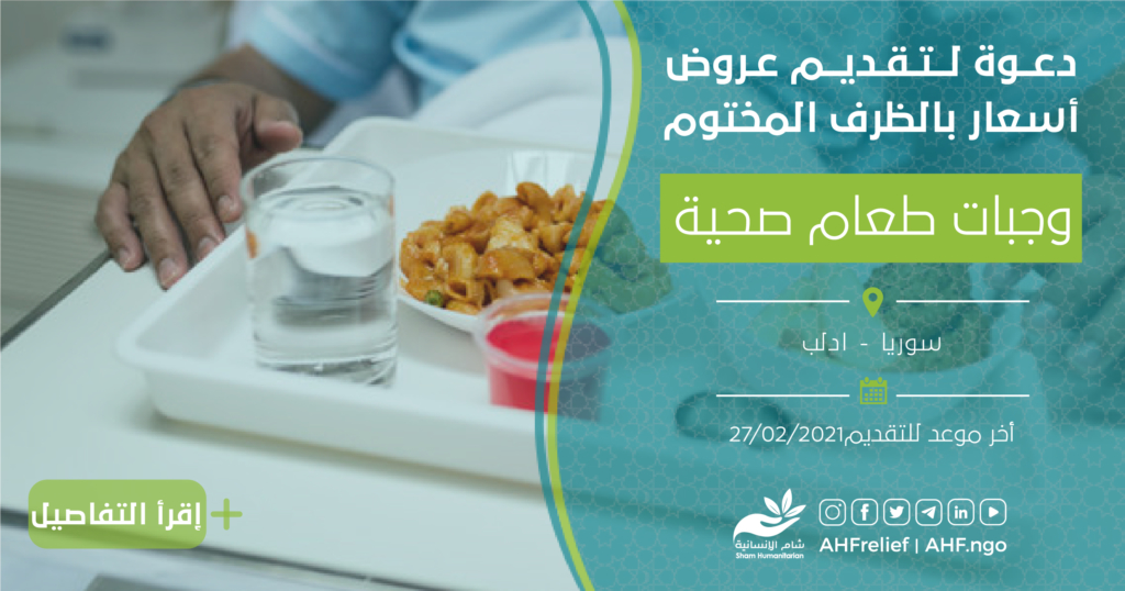تعلن جمعية شام الإنسانية عن مناقصة بالظرف المختوم لتقديم عروض اسعار وجبات طعام صحية بناء على دفتر شروط المناقصة المرفق أدناه.