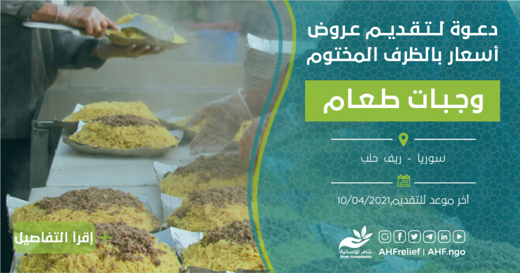 تعلن جمعية شام الإنسانية عن مناقصة بالظرف المختوم لتقديم عروض اسعار وجبات طعام بناء على دفتر شروط المناقصة المرفق أدناه.
