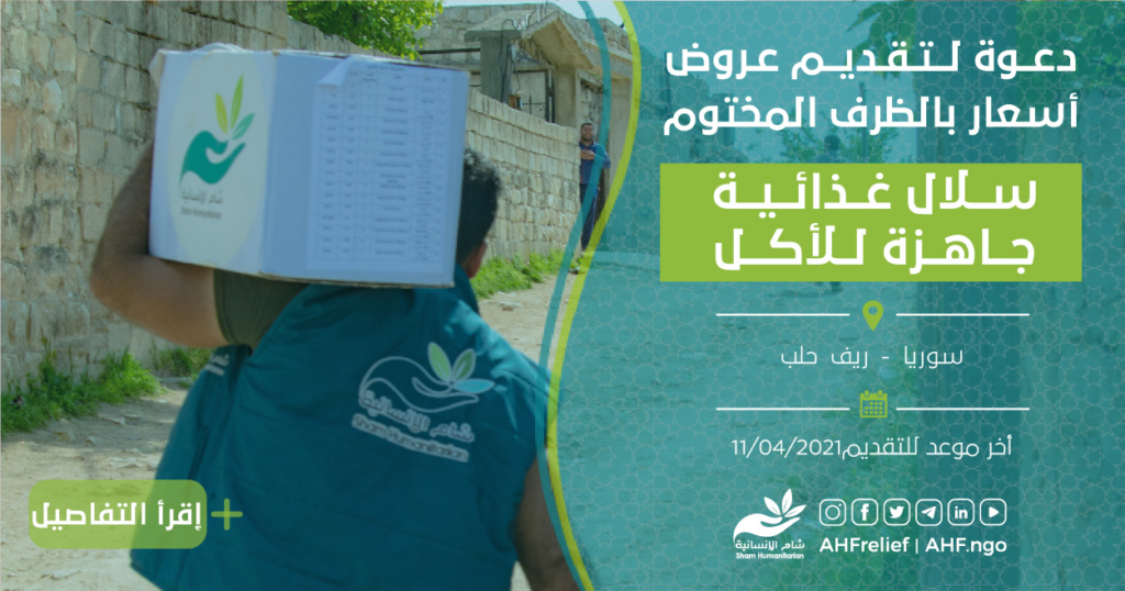 تعلن جمعية شام الإنسانية عن مناقصة بالظرف المختوم لتقديم عروض اسعار سلال غذائية جاهزة للأكل بناء على دفتر شروط المناقصة المرفق أدناه.