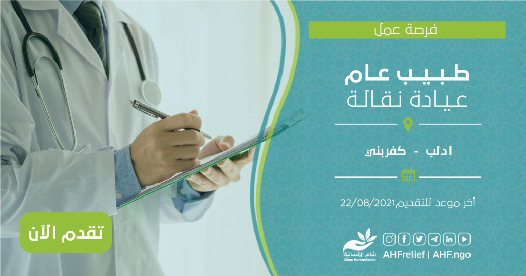 | طبيب عام عيادة نقالة | البرنامج الطبي | ادلب – كفربني | 22/08/2021 |