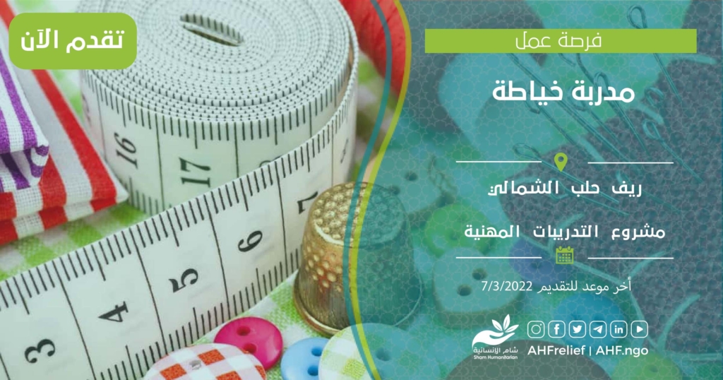 | مدربة خياطة | برنامج التعافي المبكر | ريف حلب الشمالي | 7/3/2022 |
