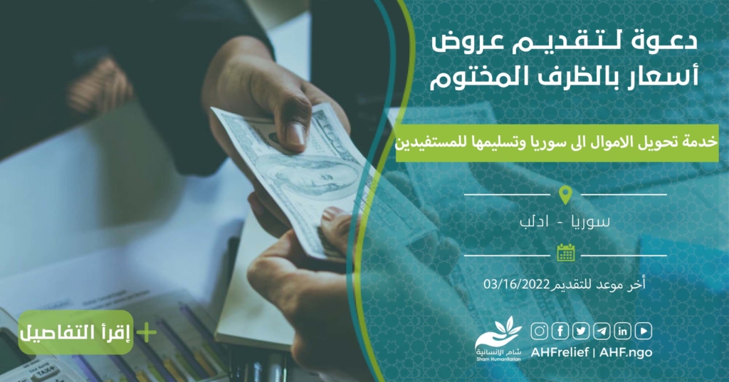تعلن جمعية الشام الإنسانية عن مناقصة بالظرف المختوم لتقديم عروض اسعار للتعاقد مع شركة حوالات مالية في منطقتي رام حمدان و معرتمصرين بناء على دفتر شروط المناقصة المرفق أدناه.