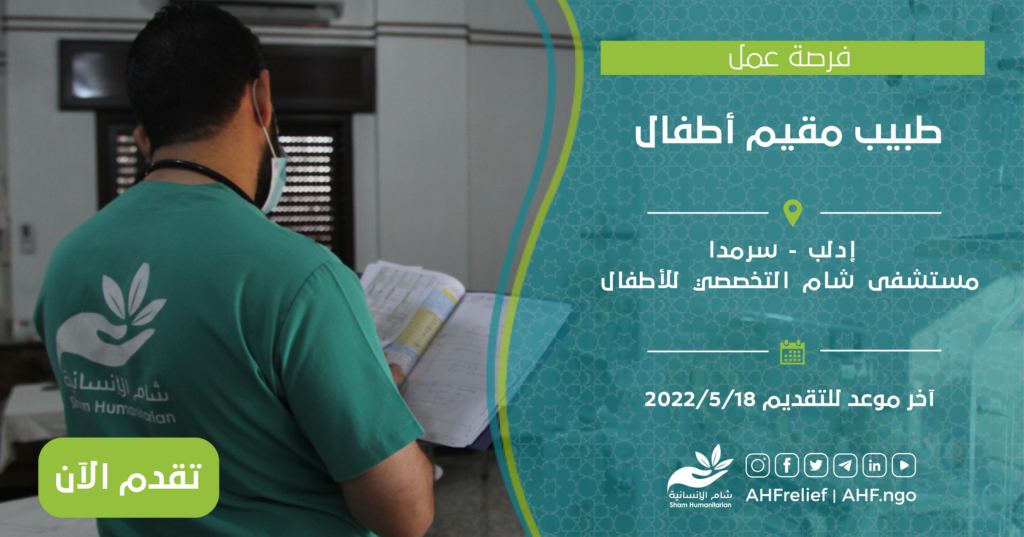 | طبيب مقيم أطفال | البرنامج الطبي | إدلب – سرمدا | 18/5/2022 |