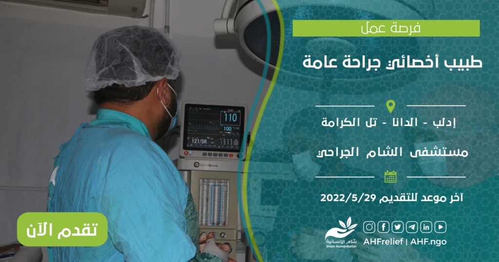 | طبيب أخصائي جراحة عامة | برنامج Health | إدلب – الدانا – تل الكرامة | 29/5/2022 |