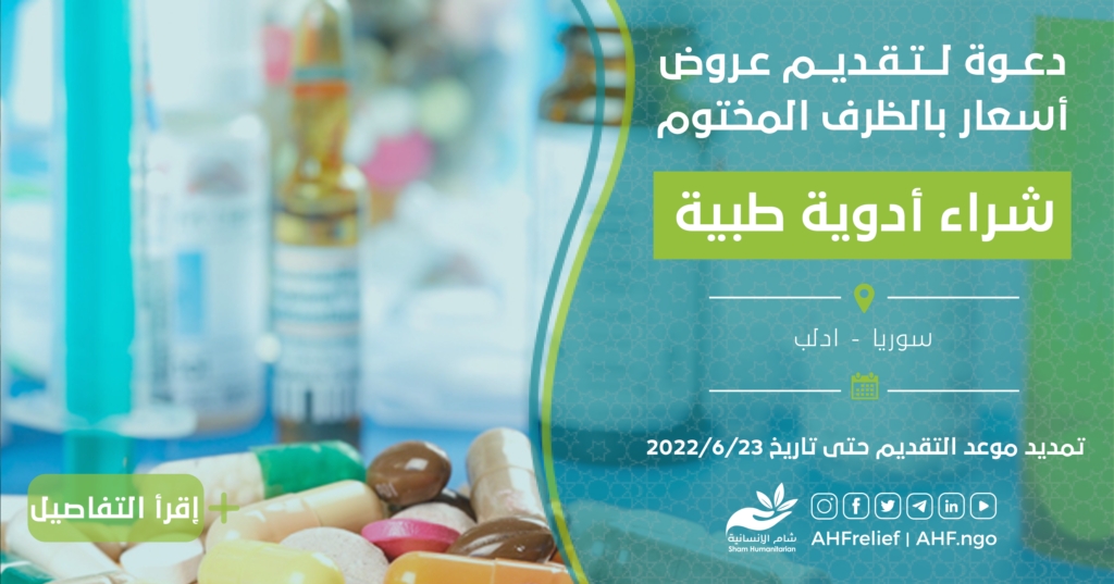تعلن جمعية الشام الإنسانية عن مناقصة بالظرف المختوم لتقديم عروض اسعار للتعاقد مع شركة للحصول على الأدوية الطبية بناء على دفتر شروط المناقصة المرفق أدناه.