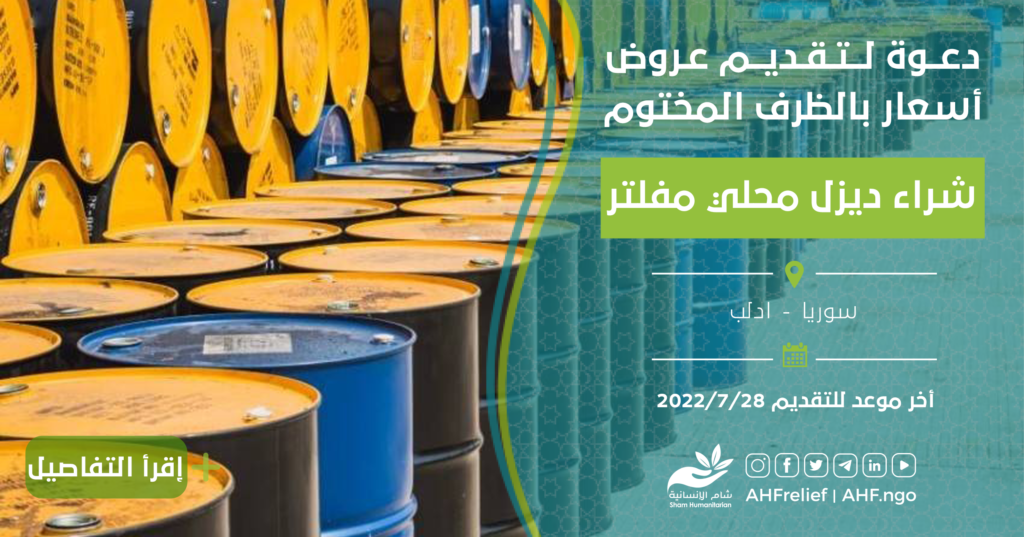 تعلن جمعية الشام الإنسانية عن مناقصة بالظرف المختوم لتقديم عروض اسعار لشراء ديزل محلي مفلتر بناء على دفتر شروط المناقصة المرفق أدناه.
