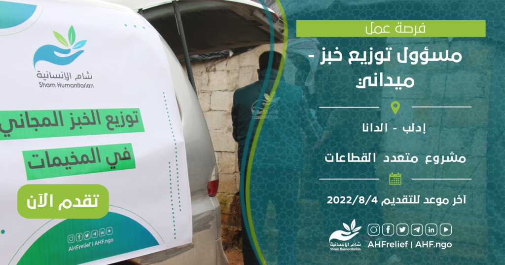 | مسؤول توزيع خبز – ميداني | برنامج FSL | إدلب – الدانا | 4/8/2022 |