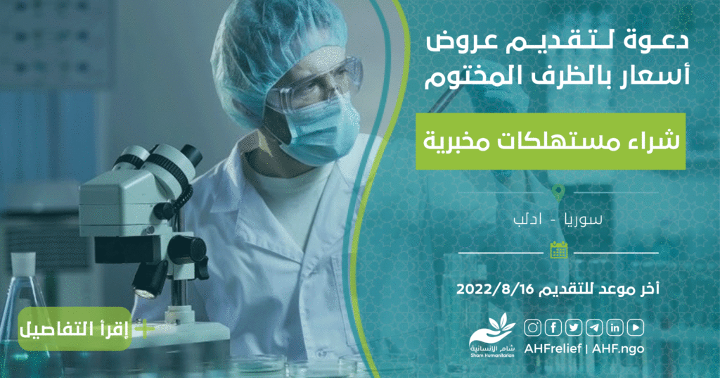 تعلن جمعية الشام الإنسانية عن مناقصة بالظرف المختوم لتقديم عروض أسعار لشراء مستهلكات مخبرية بناء على دفتر شروط المناقصة المرفق أدناه.