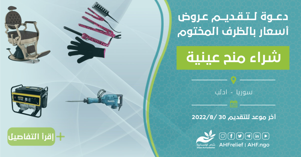تعلن جمعية الشام الإنسانية عن مناقصة بالظرف المختوم لتقديم عروض أسعار لشراء منح عينية بناء على دفتر شروط المناقصة المرفق أدناه.
