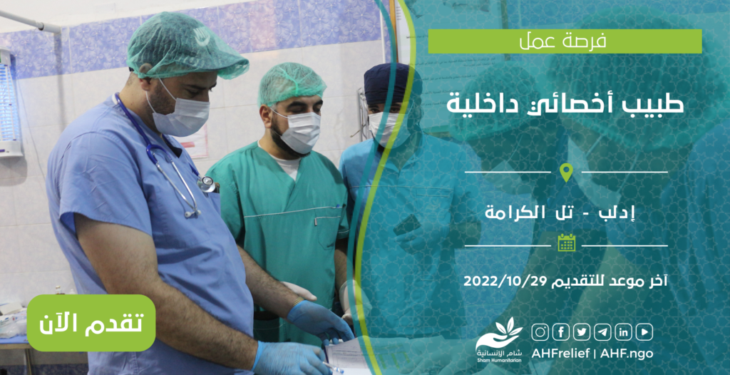 | طبيب أخصائي داخلية | برنامج Health | إدلب – تل الكرامة | 9/10/2022 |