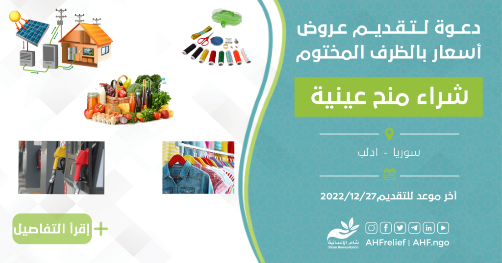 تعلن جمعية الشام الإنسانية عن مناقصة بالظرف المختوم لتقديم عروض أسعار لشراء منح عينية بناء على دفتر شروط المناقصة المرفق أدناه.