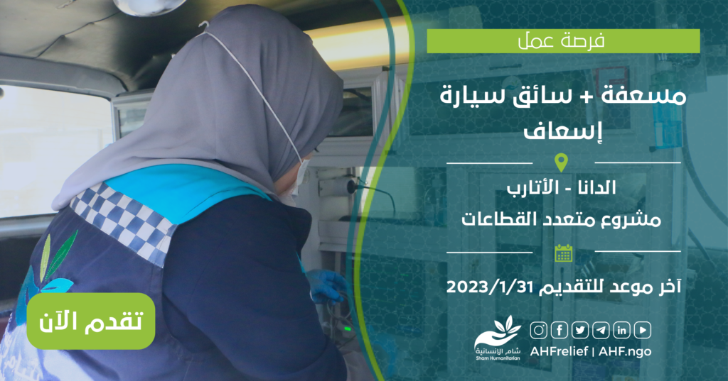 | مسعفة + سائق سيارة إسعاف (قريب من الدرجة الأولى) | برنامج Health | الدانا – الأتارب | 31/1/2023 |