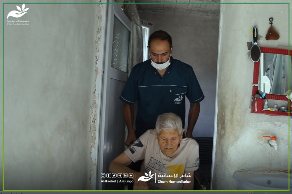 مؤسسة شام الإنسانية تقدم كرسي متحرك وفرشة هوائية لرجل مُسنْ بعد أن كان مُقعداً لأشهر طويلة.