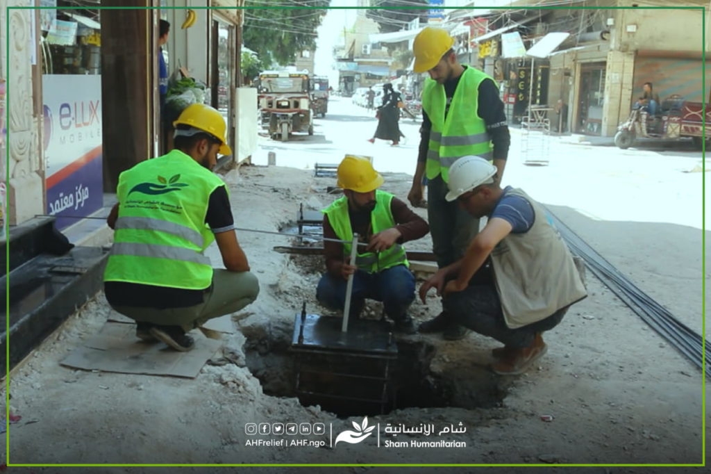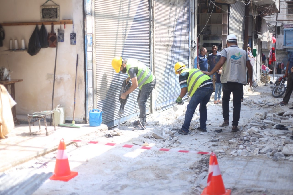 جانب من أعمال فرق التعافي المبكر في مؤسسة شام الإنسانية لترميم سوق مدينة كفرتخاريم